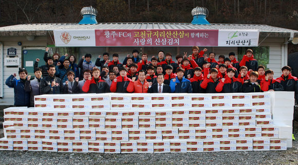 광주는 26일 전북 완주에 위치한 지리산 산삼 농장에서 선수단과 프런트 60여명이 참여한 가운데 사랑의 산삼김치 담그기 봉사활동을 실시했다.