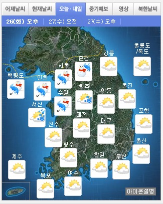 또 밤부터 중부지방에는 비가 눈으로 바뀌어 쌓이는 곳이 있겠고, 내일 27일은 새벽부터 전국 대부분 지역에서 눈 또는 비가 올 것으로 보인다. 따라서 밤사이 기온이 떨어지면서 눈이 얼어붙어 내일 아침 출근길, 교통 대란이 우려된다.