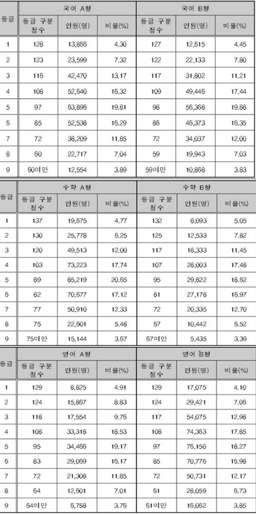 1등급과 2등급을 구분하는 1등급 커트라인(수능 등급컷)은 국어 A형이 128점, 국어 B형이 127점이었다. 수학 A형은 137점, 수학 B형은 132점이고 영어 A형 129점, 영어 B형 129점으로 나타났다.