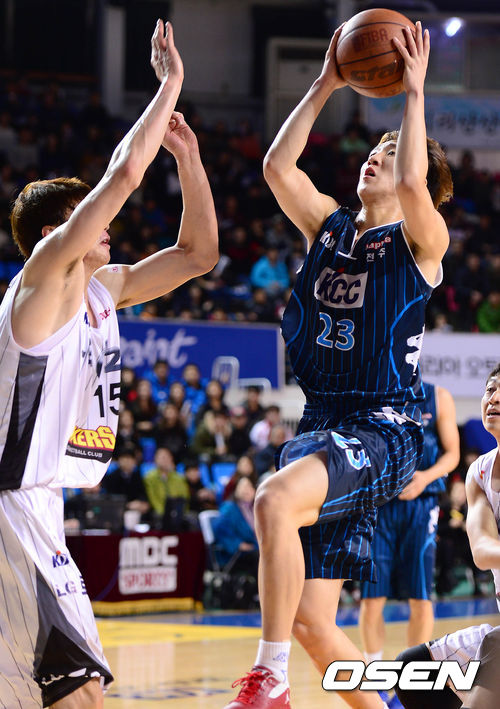 1쿼터 KCC 김민구가 LG 김종규의 슛블록을 피해 점프슛을 시도하고 있다.
