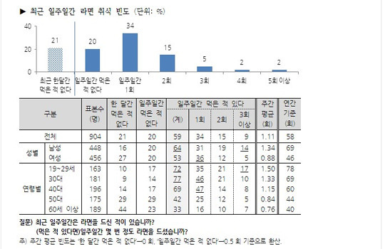 성인 열 명 중 여섯 명(59%)은 최근 일주일간 라면을 1회 이상 먹었고, 전체 성인의 라면 취식 빈도는 주간 평균 1.11회, 연간(52주) 기준 58회로 환산할 수 있다.