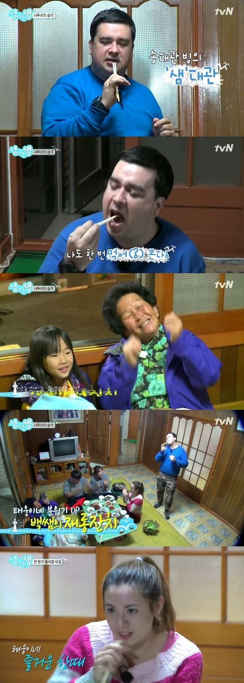 삼겹살을 맛있게 먹던 샘은 태웅이네 할머니가 노래를 요청하자, 송대관의 ‘유행가’를 부르며 분위기를 띄었다.