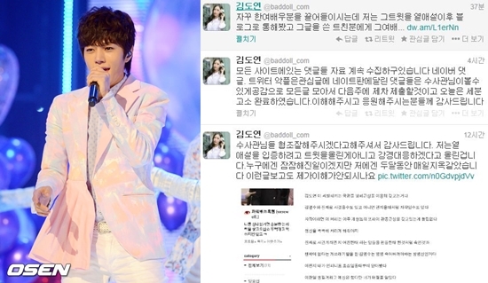 김도연은 26일 밤 자신의 트위터에 “자꾸 한 여배우를 끌어들이는데 저는 그 트윗을 열애설 이후 블로그를 통해 봤다”라며 자신은 그 글을 쓴 트친에게 그 여배우에 관해 욕설한 적이나 그 글에 답멘 또한 보낸적이 없다고 밝혔다.