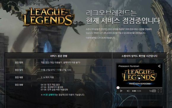 리그오브레전드의 홈페이지는 27일 오전 7시 현재 공지문이 올라 “3.14 패치 적용 작업을 위해 27일 오후 1시까지 게임과 홈페이지 이용이 불가하다”라고 알렸다.