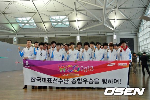 'WCG2013 그랜드 파이널'에 참가하는 한국 대표선수단이 출국 전 종합우승을 위한 결의를 다졌다. 'WCG 2013'에 참여하는 한국대표단은 27일 인천 국제공항에서 출정식을 가진 뒤, 중국 쿤산으로 출국했다.