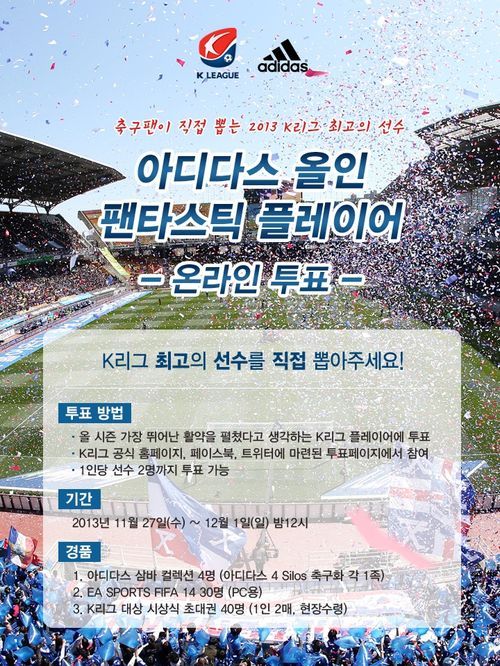 K리그가 축구팬이 직접 참여하는 ‘아디다스 올인 팬타스틱 플레이어’ 온라인 투표를 진행한다. ‘아디다스 올인 팬타스틱 플레이어’ 투표는 K리그를 사랑하는 축구팬이라면 누구나 참여할 수 있으며, 오는 12월 1일 밤 12시까지 K리그 홈페이지(www.kleague.com)와 공식 페이스북(www.facebook.com/withkleague) 트위터(@kleague), ‘오늘의 K리그’ 공식 페이스북(www.facebook.com/todaykleague) 등에서 1인 1회 참여할 수 있다.