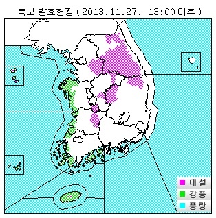 ▲대설주의보 지역(27일 오후 1시): 경기도(이천시, 여주시, 광주시, 양평군), 서해5도, 강원도(강릉시산간, 동해시산간, 태백시, 삼척시산간, 속초시산간, 고성군산간, 양양군산간, 영월군, 평창군평지, 평창군산간, 정선군평지, 정선군산간, 횡성군, 원주시, 홍천군평지, 홍천군산간, 양구군, 인제군산간), 충청남도(금산군, 계룡시), 충청북도(보은군, 제천시), 전라북도(진안군, 장수군), 경상북도(상주시, 문경시, 영양군산간, 봉화군평지, 봉화군산간, 울진군산간), 제주도(제주도산간)