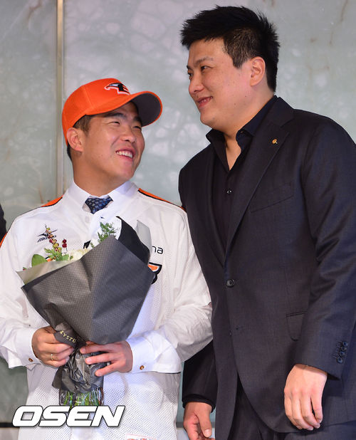 당시 정승진 사장과 한대화 감독은 물론 김태균·박정진·한상훈 등 동료들도 입단식에 참석해 자리를 빛냈다. 올해 정근우와 이용규의 입단식은 박찬호 때 못지 않은 열기를 보였다. 역대 FA 시장 최고액인 137억원을 투자해 영입한 국가대표 FA 듀오로 큰 화제를 모았다. / soul1014@osen.co.kr