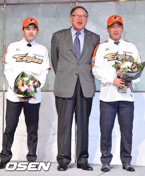 '국가대표 테이블세터' 정근우(31)와 이용규(28)가 성대한 입단식과 함께 한화맨으로 새롭게 태어났다. 정근우와 이용규는 27일 서울 플라자호텔 22층 다이아몬드홀에서 한화 입단식 및 기자회견을 가졌다. 이날 입단식에는 정승진 사장, 노재덕 단장과 함께 김응룡 감독, 주장 고동진, 김태균, 최진행이 참석해 자리를 빛냈다.