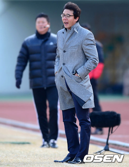 전반 포항 황선홍 감독이 선수들에게 작전을 지시하고 있다.