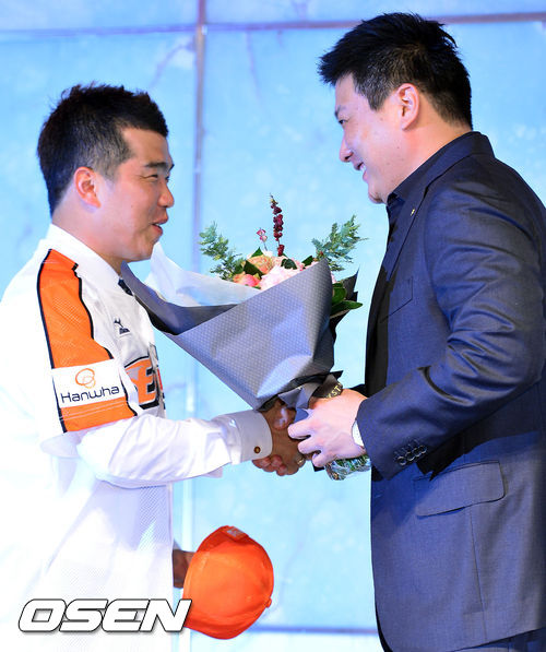 27일 오후 서울 플라자 호텔 다이아몬드홀에서 진행된 프로야구 선수 정근우와 이용규의 입단식에서 한화 정근우가 김태균에게 꽃다발 선물을 받고 있다.