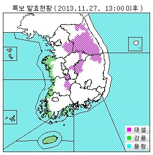 ▲대설주의보 지역(27일 오후 1시): 경기도(이천시, 여주시, 광주시, 양평군), 서해5도, 강원도(강릉시산간, 동해시산간, 태백시, 삼척시산간, 속초시산간, 고성군산간, 양양군산간, 영월군, 평창군평지, 평창군산간, 정선군평지, 정선군산간, 횡성군, 원주시, 홍천군평지, 홍천군산간, 양구군, 인제군산간), 충청남도(금산군, 계룡시), 충청북도(보은군, 제천시), 전라북도(진안군, 장수군), 경상북도(상주시, 문경시, 영양군산간, 봉화군평지, 봉화군산간, 울진군산간), 제주도(제주도산간)