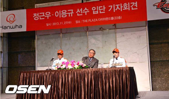 당시 정승진 사장과 한대화 감독은 물론 김태균·박정진·한상훈 등 동료들도 입단식에 참석해 자리를 빛냈다. 올해 정근우와 이용규의 입단식은 박찬호 때 못지 않은 열기를 보였다. 역대 FA 시장 최고액인 137억원을 투자해 영입한 국가대표 FA 듀오로 큰 화제를 모았다. / soul1014@osen.co.kr
