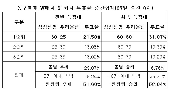 국민체육진흥공단(www.kspo.or.kr)이 발행하는 체육진흥투표권 수탁사업자인 스포츠토토의 공식 온라인 발매 사이트 베트맨(www.betman.co.kr)이 오는 28일 오후 7시 용인실내체육관에서 벌어지는 WKBL 삼성생명-우리은행전 대상 농구토토 W매치 61회차 게임 투표율을 중간 집계한 결과, 디펜딩 챔피언 우리은행의 승리를 예상했다.