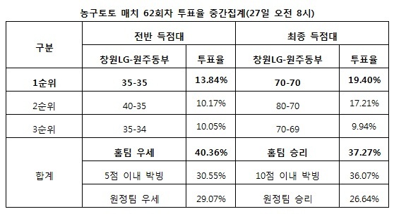 국민체육진흥공단(www.kspo.or.kr)이 발행하는 체육진흥투표권 수탁사업자 스포츠토토의 공식 온라인 발매사이트인 베트맨(www.betman.co.kr)이 오는 28일 오후 7시 창원실내체육관에서 열리는 창원LG-원주동부전을 대상으로 한 농구토토 매치 62회차 투표율을 중간 집계한 결과, 37.27%가 LG의 우세를 예상했다고 전했다.