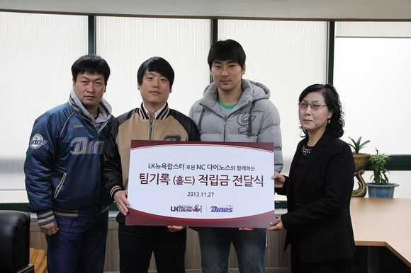 전달식에는 LK뉴욕랍스터 왕현습 사장과 NC 마케팅팀 손성욱 팀장, 오른손 투수 임창민이 참석해 적립금을 경남시각장애인복지연합회(이상순 회장)에 전달했다.