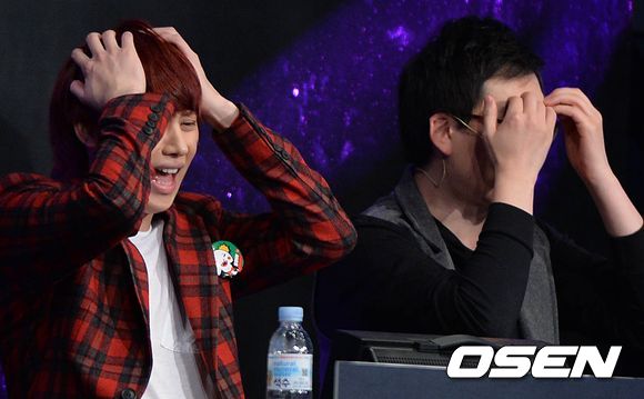 게스트로 나선 슈퍼주니어 김희철과 강민이 해설 중 아쉬움의 제스처를 취하고 있다.