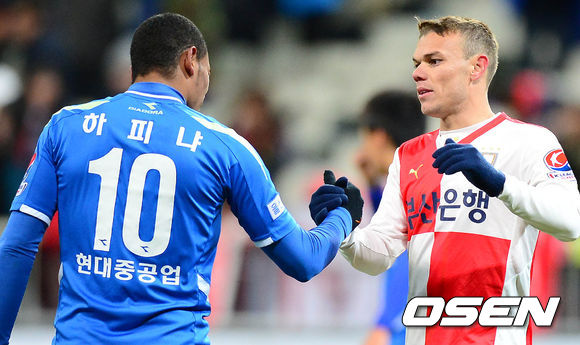 27일 오후 부산 아시아드 주경기장에서 열린 '2013 현대오일뱅크 K리그 클래식' 부산 아이파크와 울산 현대의 경기 종료 후 하피냐와 파그너가 인사를 나누고 있다.