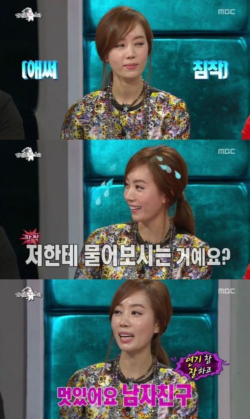 김유미는 27일 오후 방송된 MBC 예능프로그램 '황금어장-라디오스타'(이하 '라디오스타')에서 거듭되는 MC들의 정우 관련 대화에 당황하는 모습을 숨기지 못했다.