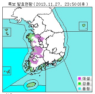 대설주의보 특보 발효지역으로는 충청남도(천안시, 아산시, 청양군, 보령시, 서천군, 계룡시), 충청북도(청주시, 청원군), 전라남도(나주시, 장성군, 화순군, 함평군, 영광군), 전라북도(고창군, 부안군, 군산시, 김제시, 완주군, 진안군, 임실군, 익산시, 정읍시, 전주시, 남원시), 제주도(제주도산간), 세종특별자치시이다.