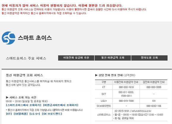 또한 '통신 미환급액 조회 서비스는 언제라도 이용이 가능합니다. 이용이 불편하시면 접속이 원활한 시간에 다시 이용하여 주시기 바랍니다. 통신 미환급액은 해지하신 통신사 홈페이지에서도 직접 조회하실 수 있습니다'라고 덧붙였다.
