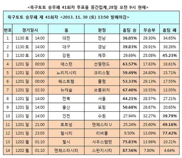 [축구토토] 국민체육진흥공단(www.kspo.or.kr)이 발행하는 체육진흥투표권 수탁사업자인 스포츠토토 온라인 공식 발매사이트 베트맨(www.betman.co.kr)은 오는 30일부터 내달 2일까지 벌어지는 잉글랜드 프리미어리그(EPL) 8경기 및 K리그 클래식 6경기 등 총 14경기를 대상으로 한 축구토토 승무패 41회차 투표율 중간집계 결과, 울산-포항(9경기)전에서 국내 축구팬 50.68%는 울산이 승리를 거둘 것으로 예상했다고 밝혔다.
