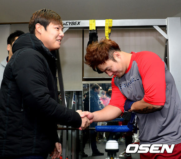 넥센 히어로즈로 트레이드 된 윤석민이 28일 오후 서울 목동구장에서 코칭스태프 및 선수단과 첫 인사를 가졌다.