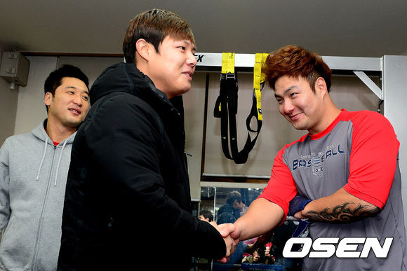 넥센 히어로즈로 트레이드 된 윤석민이 28일 오후 서울 목동구장에서 코칭스태프 및 선수단과 첫 인사를 가졌다.
