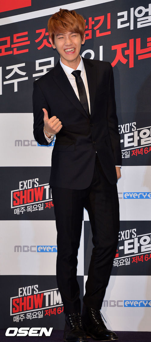 28일 오후 서울 영등포구 여의도 IFC몰 여의도CGV에서 열린 MBC에브리원 '엑소 쇼타임'(EXO's Show Time) 제작발표회에서 엑소의 백현이 포토타임을 갖고 있다.