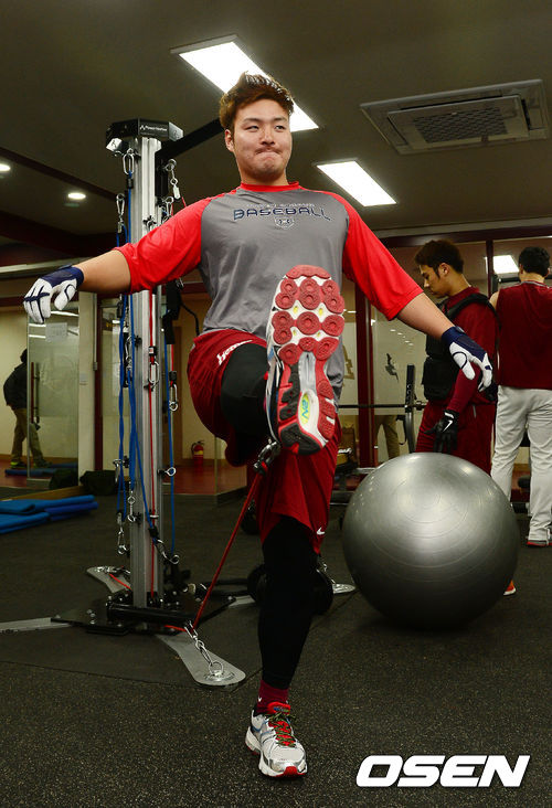 윤석민이 선수단과 인사하기에 앞서 박병호가 웨이트 트레이닝을 하고 있다.