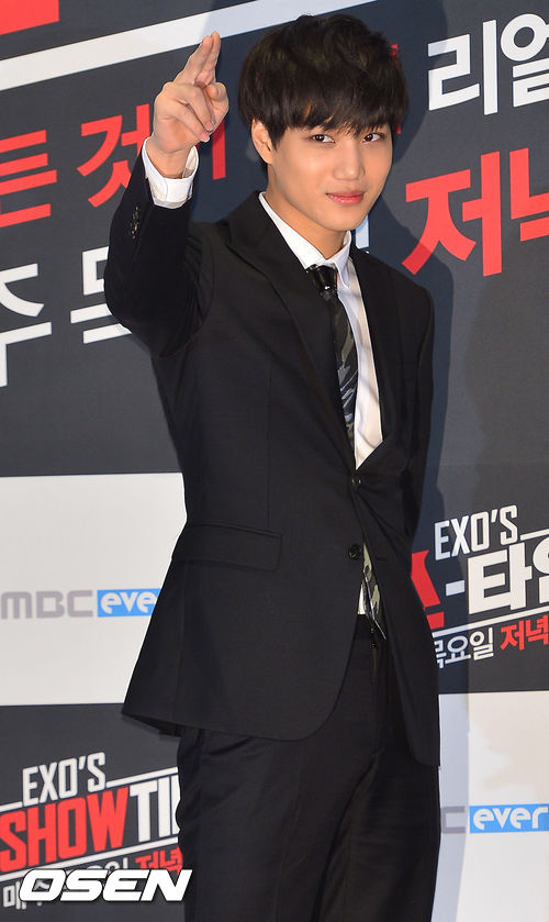 28일 오후 서울 영등포구 여의도 IFC몰 여의도CGV에서 열린 MBC에브리원 '엑소 쇼타임'(EXO's Show Time) 제작발표회에서 엑소의 카이가 포토타임을 갖고 있다.