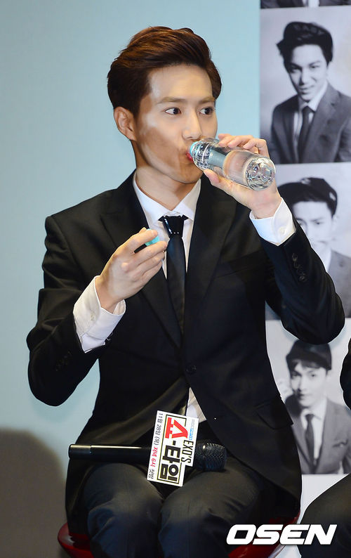 28일 오후 서울 영등포구 여의도 IFC몰 여의도CGV에서 열린 MBC에브리원 '엑소 쇼타임'(EXO's Show Time) 제작발표회에서 엑소의 수호가 물을 마시고 있다.