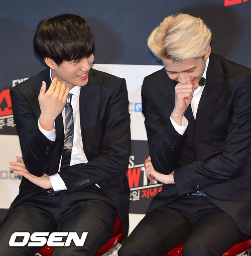 28일 오후 서울 영등포구 여의도 IFC몰 여의도CGV에서 열린 MBC에브리원 '엑소의 쇼타임'(EXO's Show Time) 제작발표회에서 엑소의 카이와 세훈이 즐겁게 얘기를 나누고 있다.