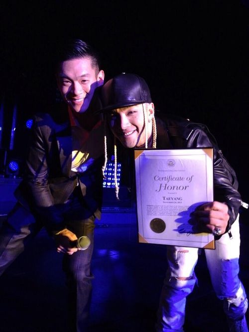 사진 속 로우는 태양과 어깨동무를 한 채 카메라를 향해 환하게 웃고 있다. 그의 옆에 선 태양은 로우로부터 받은 명예 위촉장(Certificate of Honor)을 든 채 미소짓고 있다.