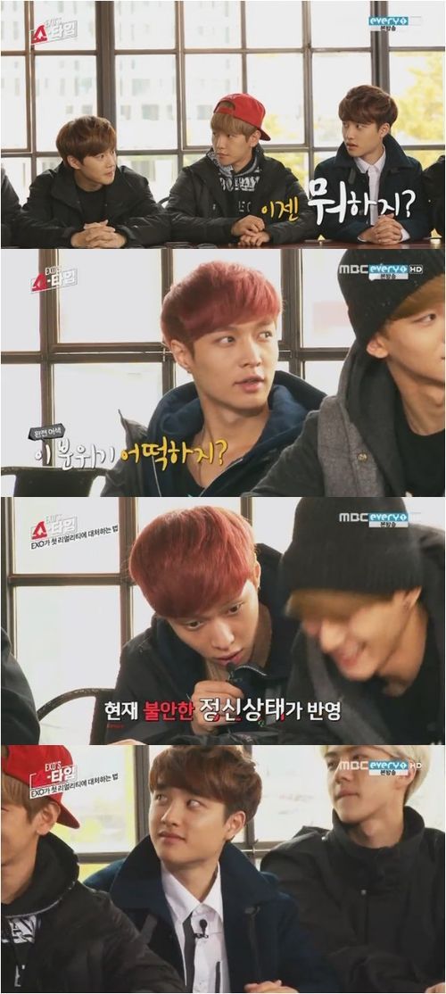 28일 오후 첫 방송된 MBC에브리원 예능프로그램 ‘엑소의 쇼타임’은 카메라만 덩그러니 놓인 가운데 엑소 멤버들이 어쩔 줄 몰라 하는 모습이 그려졌다. 멤버들은 마이크에 대고 목소리를 높이거나 흔들리는 눈동자로 불안한 심리상태를 보여줬다.