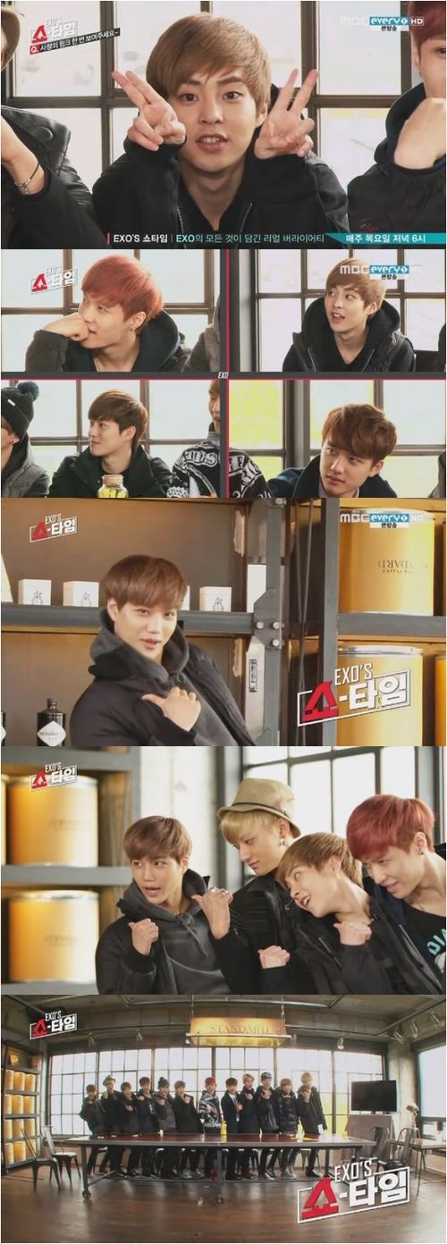 28일 오후 첫 방송된 MBC에브리원 예능프로그램 ‘엑소의 쇼타임’은 엑소 멤버 전원에 대한 궁금증을 풀어가는 리얼리티 프로그램이다. 리얼리티 프로그램답게 엑소의 실생활을 볼 수 있다는 점에서 관심을 모았다. 제작진이 화면을 통해 멤버들에게 과제를 제시하면 멤버들이 자유롭게 수행하면서 팬들이 궁금해하는 호기심을 풀어주는 재미가 있다.