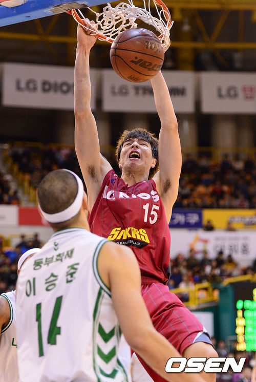 3쿼터 LG 김종규가 투핸드 덩크슛을 시도하고 있다.