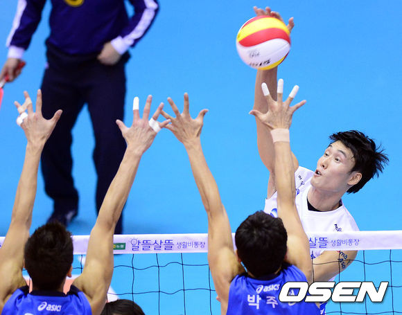 28일 오후 아산 이순신 실내체육관에서 열린 '2013-2014 NH농협 V리그' 남자부 우리카드와 현대캐피탈의 경기 2세트 최홍석이 공격을 시도하고 있다.