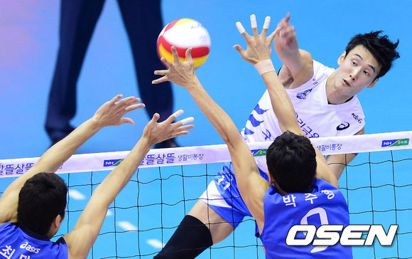 28일 오후 아산 이순신 실내체육관에서 열린 '2013-2014 NH농협 V리그' 남자부 우리카드와 현대캐피탈의 경기 2세트 최홍석이 공격을 시도하고 있다.