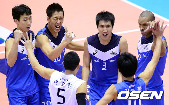 28일 오후 아산 이순신 실내체육관에서 열린 '2013-2014 NH농협 V리그' 남자부 우리카드와 현대캐피탈의 경기 2세트 현대캐피탈 선수들이 득점 후 환호하고 있다.