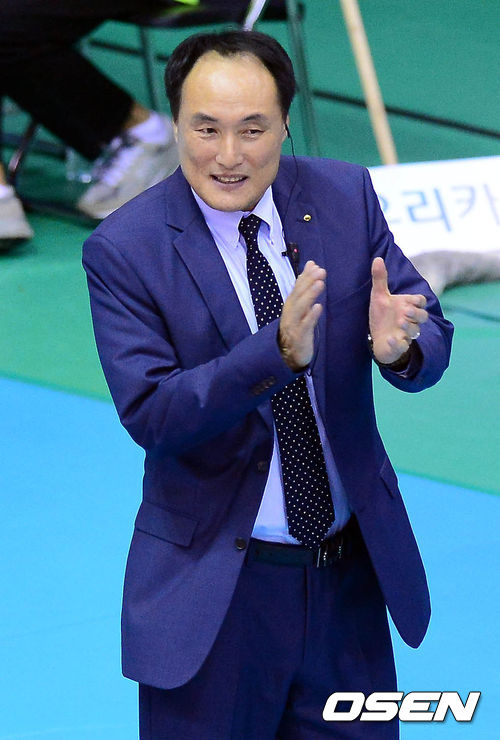 28일 오후 아산 이순신 실내체육관에서 열린 '2013-2014 NH농협 V리그' 남자부 우리카드와 현대캐피탈의 경기 2세트 우리카드 강만수 감독이 선수들에게 박수를 보내고 있다.