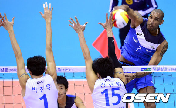 28일 오후 아산 이순신 실내체육관에서 열린 '2013-2014 NH농협 V리그' 남자부 우리카드와 현대캐피탈의 경기 1세트 아가메즈가 공격을 시도하고 있다.