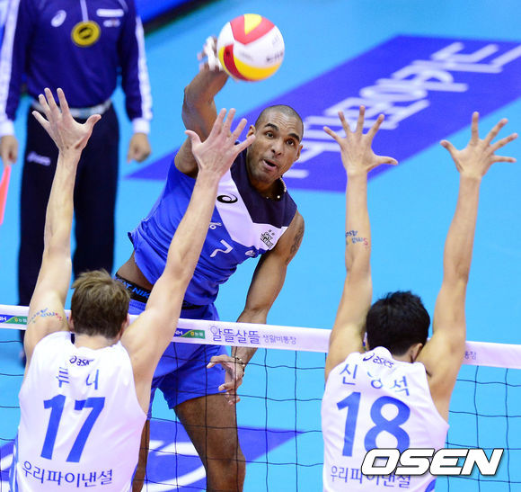 28일 오후 아산 이순신 실내체육관에서 열린 '2013-2014 NH농협 V리그' 남자부 우리카드와 현대캐피탈의 경기 1세트 아가메즈가 공격을 시도하고 있다.