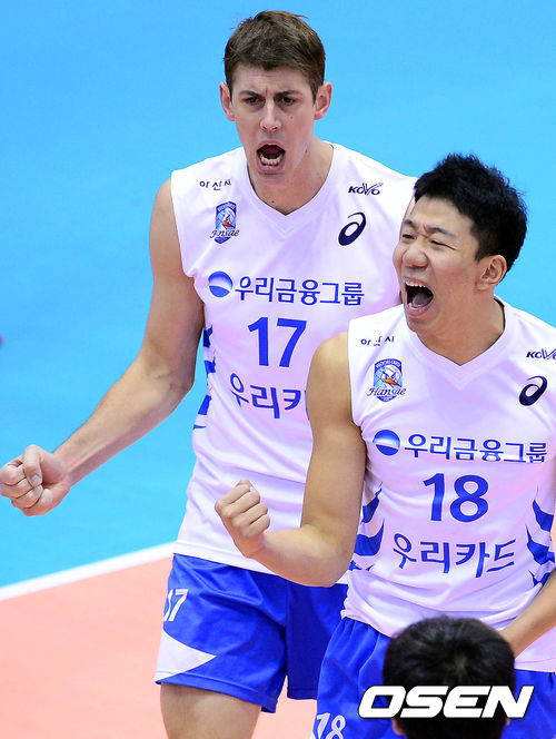 28일 오후 아산 이순신 실내체육관에서 열린 '2013-2014 NH농협 V리그' 남자부 우리카드와 현대캐피탈의 경기 1세트 우리카드가 득점 후 루니와 신영석이 환호하고 있다.