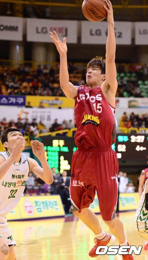 4쿼터 LG 김종규가 점프슛을 시도하고 있다.