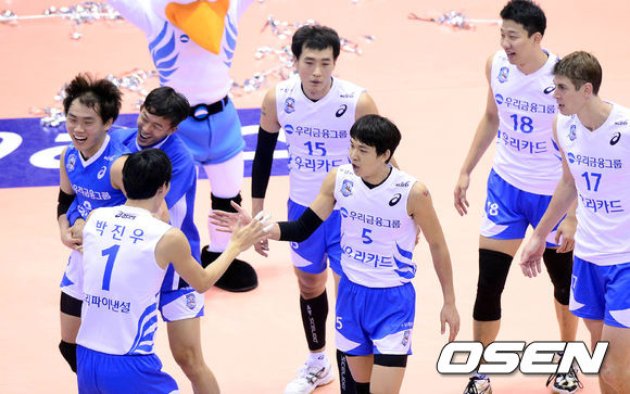 28일 오후 아산 이순신 실내체육관에서 열린 '2013-2014 NH농협 V리그' 남자부 우리카드와 현대캐피탈의 경기 종료 후 우리카드 선수들이 승리를 기뻐하고 있다.