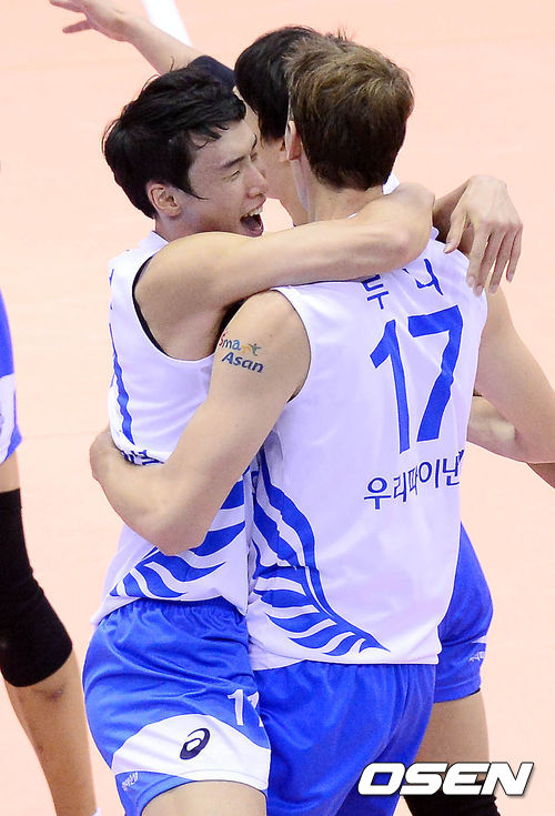 아산 우리카드 한새가 28일 아산이순신실내체육관에서 열린 NH농협 2013-2014시즌 V리그 남자부 2라운드 현대캐피탈과 경기서 세트스코어 3-0(29-27, 27-25, 25-19)로 승리를 거뒀다. 이날 승리로 우리카드는 5승 2패(승점 14)를 기록하며 현대캐피탈(4승 2패, 승점 12)을 끌어내리고 3위로 도약했다. / baik@osen.co.kr