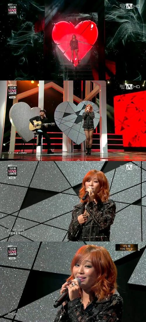 효린은 28일 방송된 케이블채널 Mnet 단독컴백쇼 '효린's 러브 앤 헤이트(HYOLYN'S LOVE&HATE)'에서 더블 타이틀 곡 중 '론리(Lonely)' 무대를 꾸몄다.