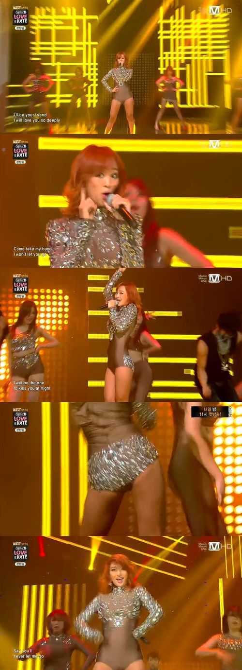 이날 효린은 과감한 노출이 돋보이고 광택이 감도는 타이트한 수영복 의상을 입고 파워풀한 댄스를 선사했다.