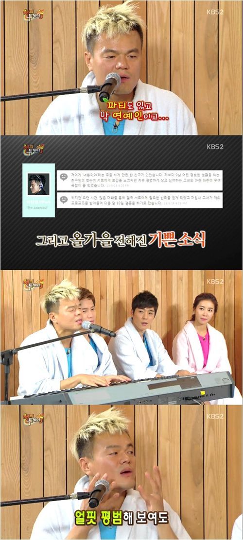 박진영은 28일 방송된 KBS 2TV 예능프로그램 ‘해피투게더3’에서 결혼한지 1달 반 정도 됐다면서 아내에 대한 애정을 드러냈다.
